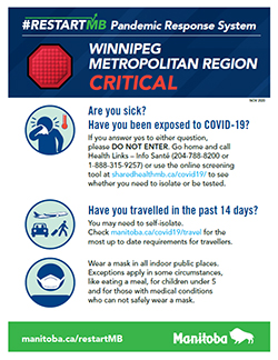 Manitoba is the countrys COVID-19 hotspot and officials say the province could face more restrictions if the number of cases doesnt start falling soon. That announcement was made today by Premier Brian Pallister and Chief Provincial Public Health Officer. Information about flights or other locations where people might have been exposed to COVID-19 are posted on this site as information becomes available to public health through case investigations.